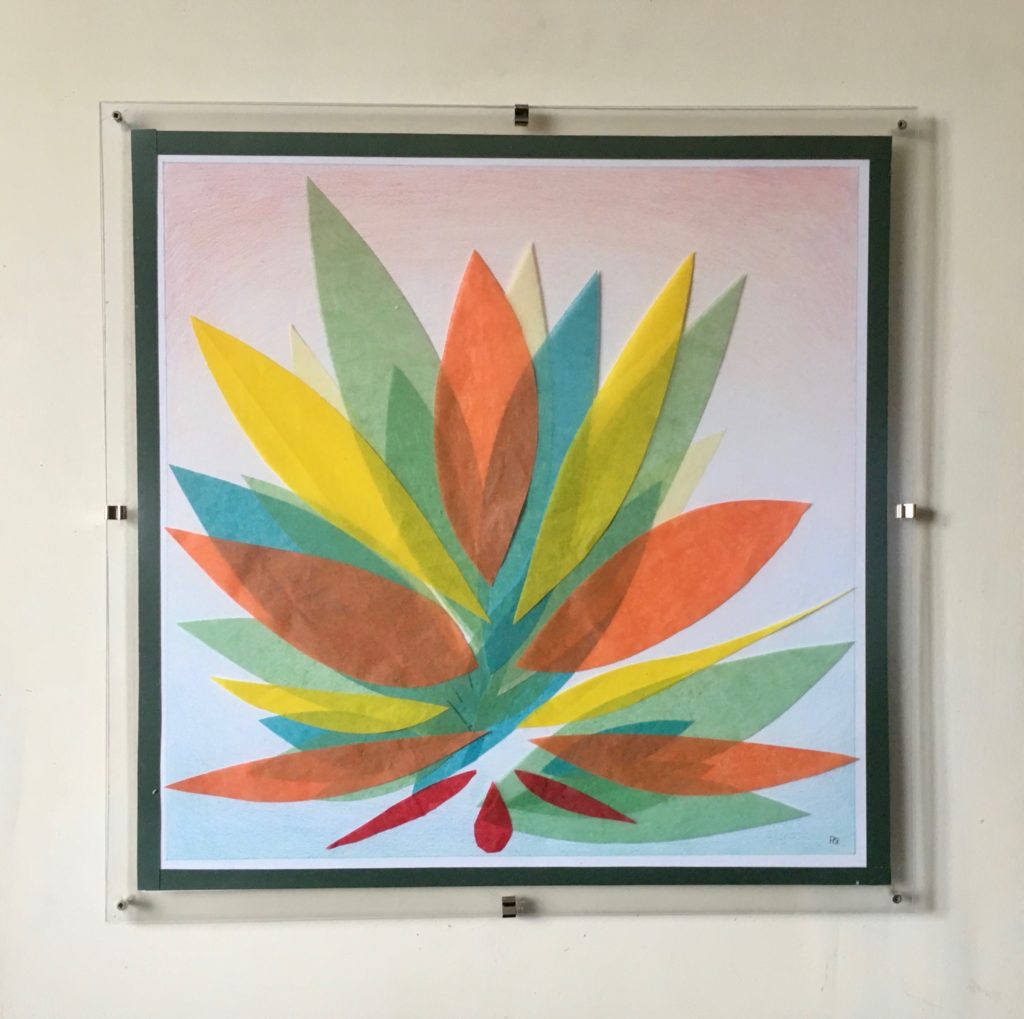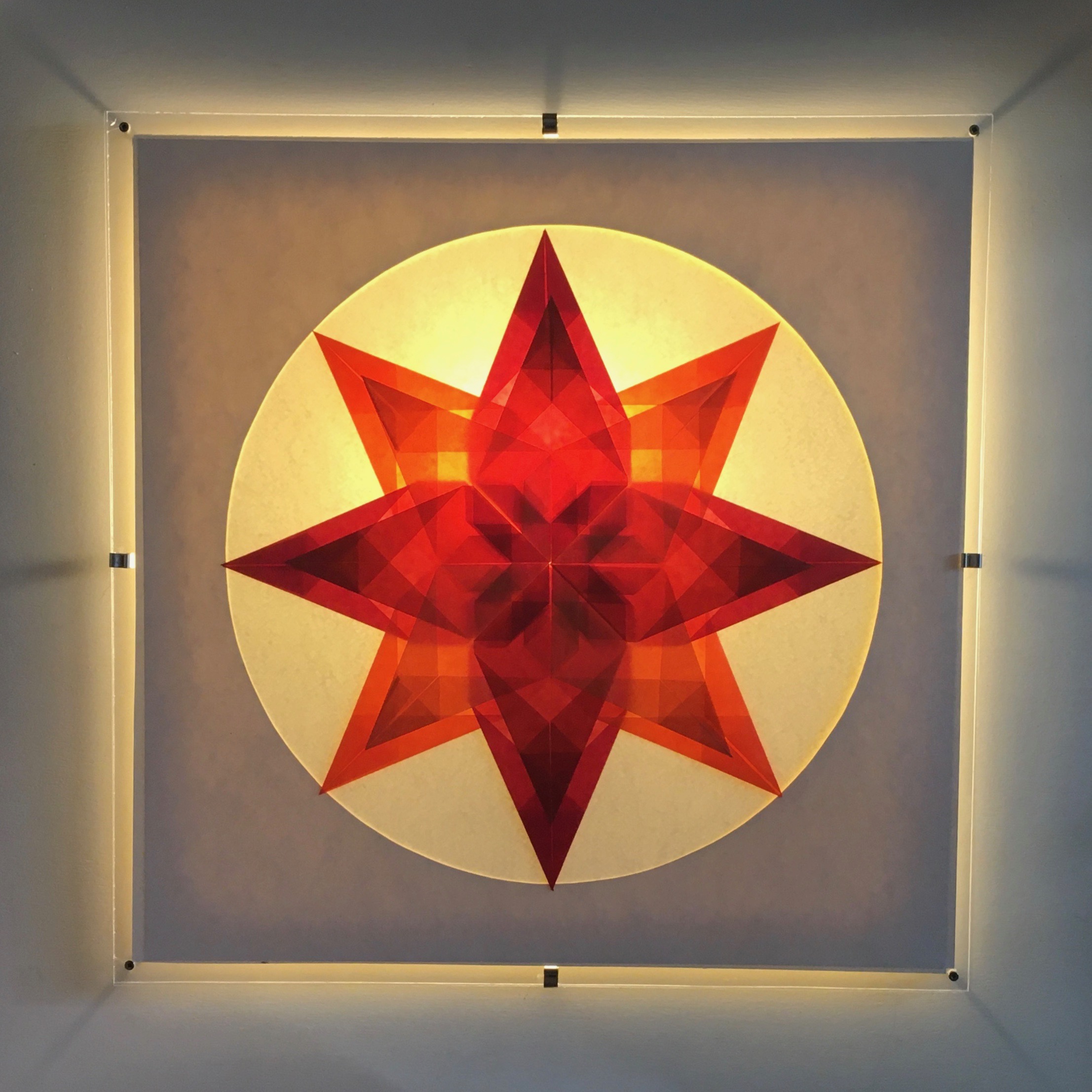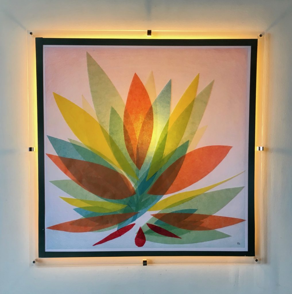 L’ensemble de ces réalisations sont montées dans un encadrement bois de 55x55cm avec un éclairage incorporé placé derrière l’aquarelle, ou le papier découpé.